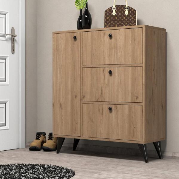 Fáradt vagy attól, hogy megbotlasz a bejáratodban szétszórt cipőkben? Mondj búcsút a rendetlenségnek, és köszöntsd az organizációt lenyűgöző Tölgy Cipőszekrényünkkel. Szervezd meg a tered stílusosan Ez a cipőszekrény nem csupán egy bútordarab, hanem egy stílusos kiegészítő az otthonod számára. A letisztult tölgy szín egy csipetnyi kifinomultságot ad bármelyik helyiséghez, míg a bohémiás koncepció melegséget és kényelmet sugall. Három tágas fiókjával és számos polcával bőven lesz helyed, hogy tárold kedvenc lábbelijeidet. Minőségi Kivitelezés A 100%-ban melamin bevonatú forgácslapból készült cipőszekrény tartós és hosszú élettartamú. A 18 mm-es vastagság biztosítja a tartósságot és a stabilitást, míg a műanyag lábak extra támogatást nyújtanak. Még a falra is rögzítheted a fokozott biztonság érdekében. Műszaki Részletek: