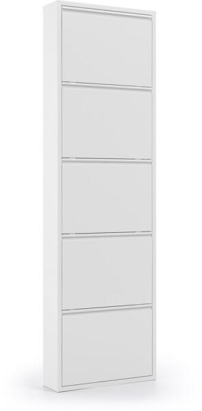 A Kave Home Rox fehér cipősszekrény keskeny, de tágas bútor. Az 5 dönthető fióknak köszönhetően elegendő helyet biztosít a cipők számára, és nem foglal sok helyet. Tartós fémből készült. Hátoldalán lyukak találhatók, melyek segítségével biztonságosan a falhoz rögzíthető. Megjegyzés: A fiókok egyszerre nyílnak.